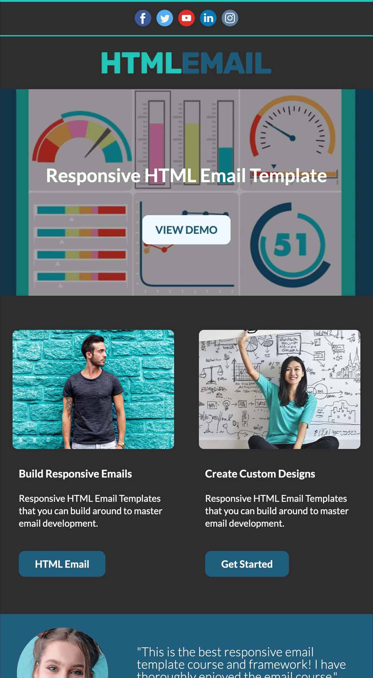 From my HTML email course on Udemy, this design has dark mode specific CSS styling as well as a GIF BG image & bulletproof buttons.